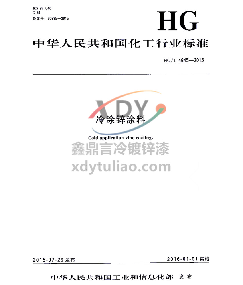 HG/T 4845-2015冷涂鋅涂料標(biāo)準(zhǔn) 備案號(hào):50885-2015 中華人民共和國(guó)化工行業(yè)標(biāo)準(zhǔn) HG/T 4845-2015 冷涂鋅涂料Cold application zinc coatings 2015-07-29發(fā)布 2016-01-01實(shí)施 中華人民共和國(guó)工業(yè)和信息化部發(fā)布 本標(biāo)準(zhǔn)適用于常溫施涂的高鋅含量的有機(jī)涂料。該產(chǎn)品是由鋅粉、有機(jī)樹(shù)脂、溶劑等組成的單組分涂料,主要用于鋼鐵底材暴