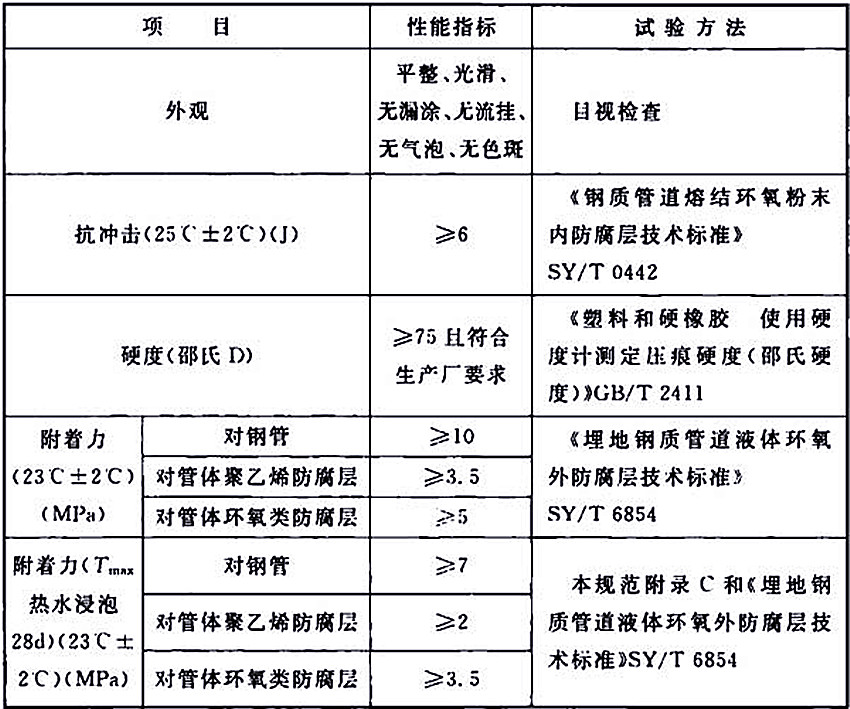 4.3 補口防腐層質(zhì)量檢驗應(yīng)包括外觀、厚度、硬度、漏點和附著力,并應(yīng)符合下列規(guī)定: