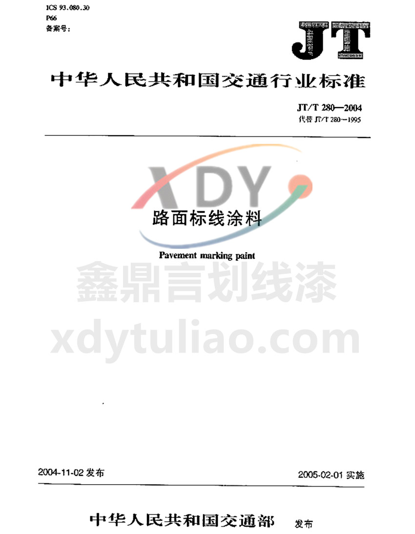 JT/T 280-2004路面標(biāo)線涂料標(biāo)準(zhǔn)是防腐涂料小編照搬JT/T 280-2004《路面標(biāo)線涂料》紙質(zhì)版內(nèi)容,大家可以放心參考。更多防腐涂料執(zhí)行國家和行業(yè)標(biāo)準(zhǔn)等防腐涂料相關(guān)信息可以參考官網(wǎng):m.guangst.com ICS 93.080.30 P66 JT 中華人民共和國交通運(yùn)輸行業(yè)標(biāo)準(zhǔn) JT/T 280-2004路面標(biāo)線涂料Pavement